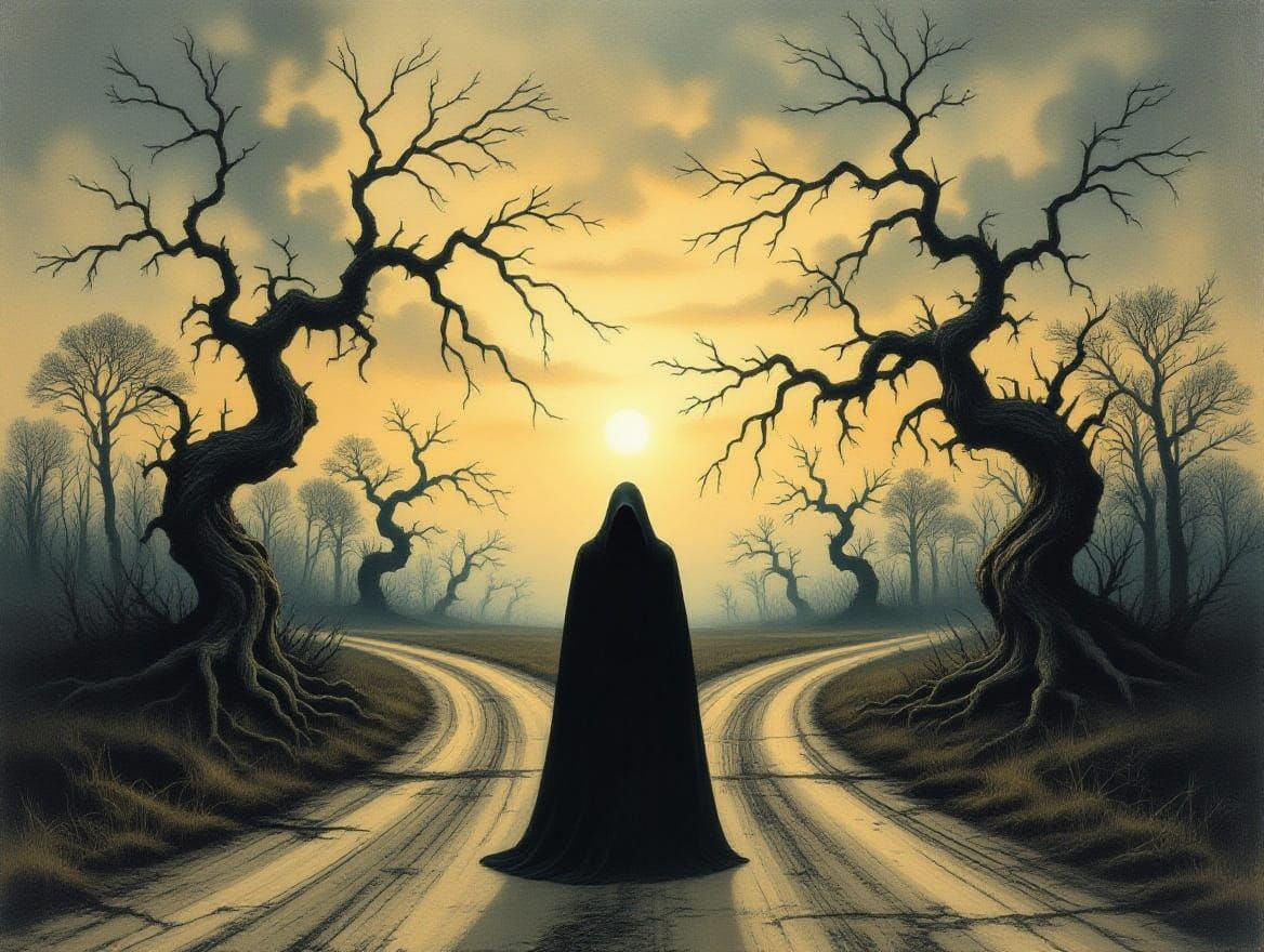 A hooded figure stands at a crossroads surrounded by twisted trees in a dark, eerie twilight atmosphere, reminiscent of gothic art and supernatural landscapes.