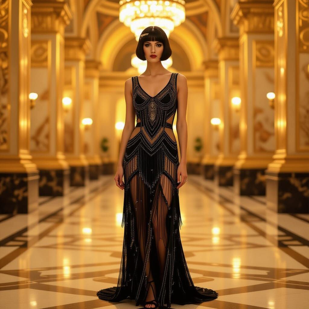 This image shows a woman in a 1920s-style beaded gown and bob haircut in an opulent, golden hall. The geometric patterns evoke an art deco aesthetic.