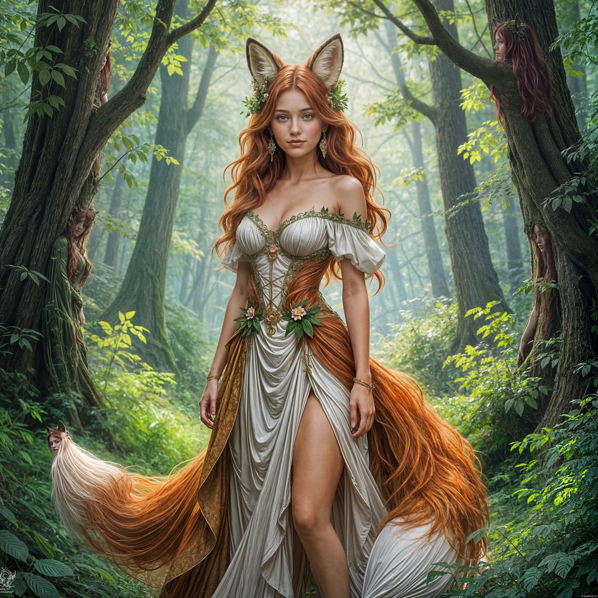 A stunning image of a fox-eared woman with red hair in an enchanted forest. She wears a flowing gown with earthy tones, rendered with hyperrealistic fantasy art nouveau elements.