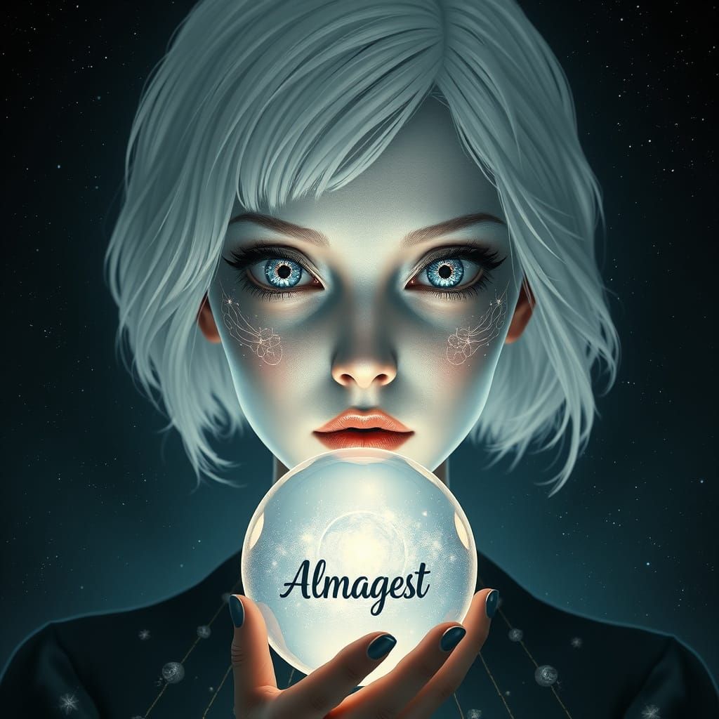 This image shows a detailed portrait of a woman in a starlit void, with cosmic eyes and faint constellation markings, holding a glowing orb.