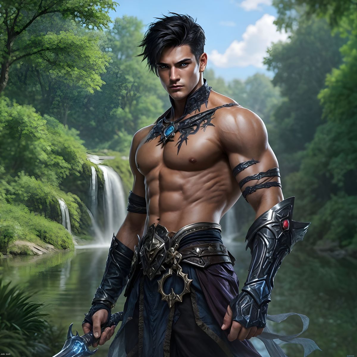 A striking portrait of an attractive young swordsman in fantasy attire. The artwork features dynamic lighting and vibrant colors, rendered in a fantasy art style.