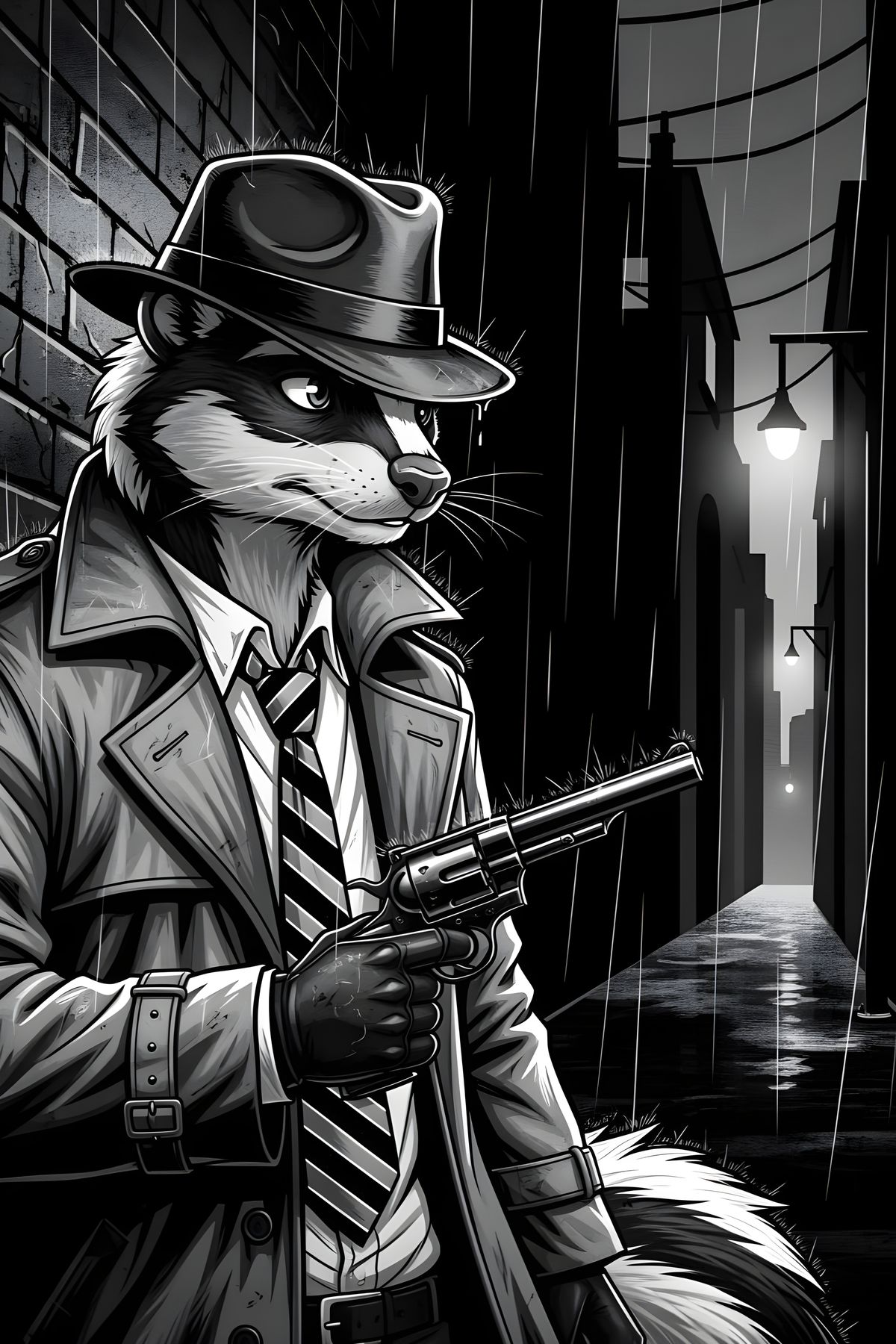 This image depicts a film noir scene with an anthropomorphic skunk detective. The skunk, armed with a pistol, lurks in the shadows, creating a dramatic and mysterious atmosphere.