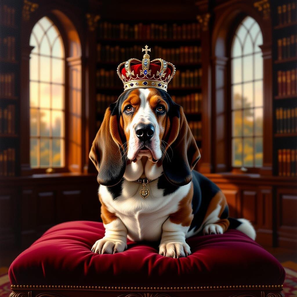 A hyper-realistic oil painting depicts a distinguished Basset Hound wearing a crown, seated on a velvet cushion in a library. The art style features Vermeer and Rembrandt influences with dramatic lighting and rich colors.