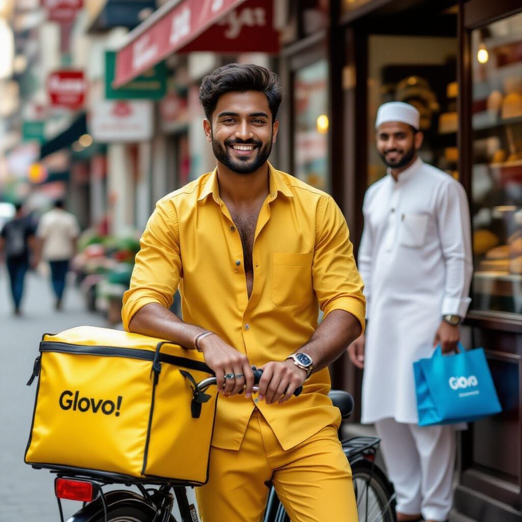 very handsome cyclist Glovo Bangladeshi. beautiful fleshy mouth with beautiful smile. he wears yellow Bermuda shirt and trousers. lean muscular physique. unbuttoned shirt and you can glimpse beautiful hairy chest. he is leaning on the bicycle seat in a city street. behind the bicycle is a yellow square ...