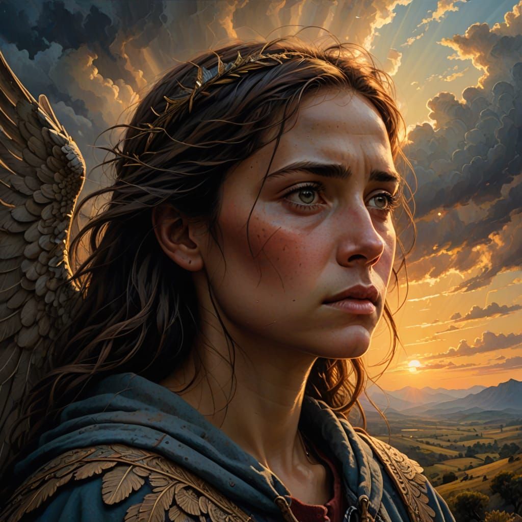 A dramatic close-up of an angel overlooking humanity from a mountaintop. The angel's tearful eyes and torn wing are rendered in hyperrealism, with a muted, somber color palette and crepuscular lighting.