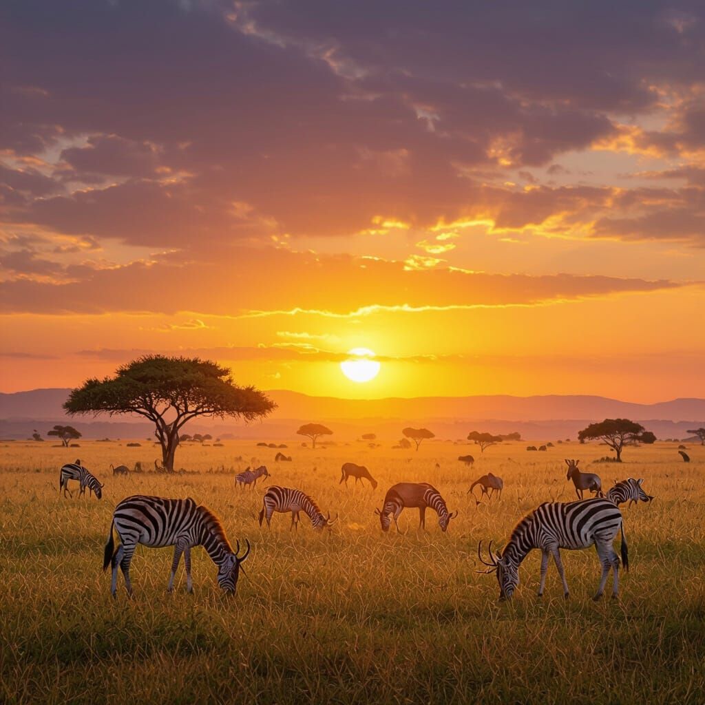 Generate your own vibrant, realistic images of African Savannah landscapes and wildlife at sunrise. Free and easy to use!