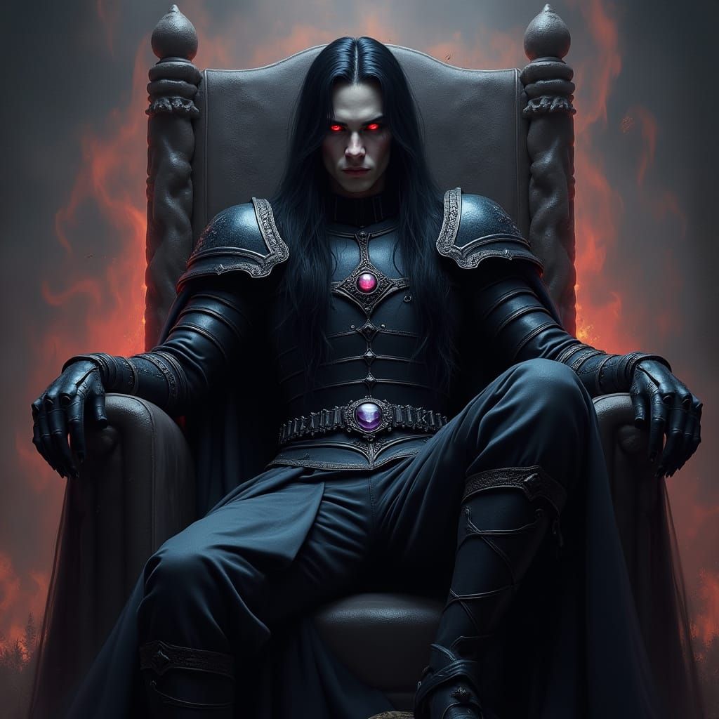 Vayne Bloodsoul is the Emperor of Darkstone, a wasteland of corruption, darkness, and undead creatures. As the iron-fisted ruler, Vayne is infamous for his cruelty, swift justice, and unmatched cunning. His pale, handsome featuresโlong black hair, a flawless complexion, and piercing violet eyes that glow red when stirred by anger or emotionโstrike fear and awe into all who see him.