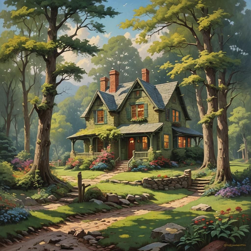 Easily generate your own Thomas Kincaid-inspired cottage images with our free AI image generator, featuring oil painting style like James Gurney