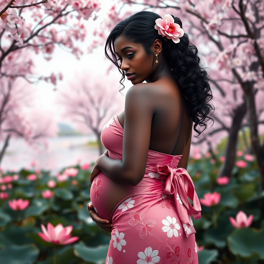 A stunning portrait of a pregnant woman with a curvy figure, wearing a pink kimono corset bikini with cherry blossom markings, standing in a mystical cherry blossom meadow near a rainbow lake, blending traditional and modern art styles with surreal elements.