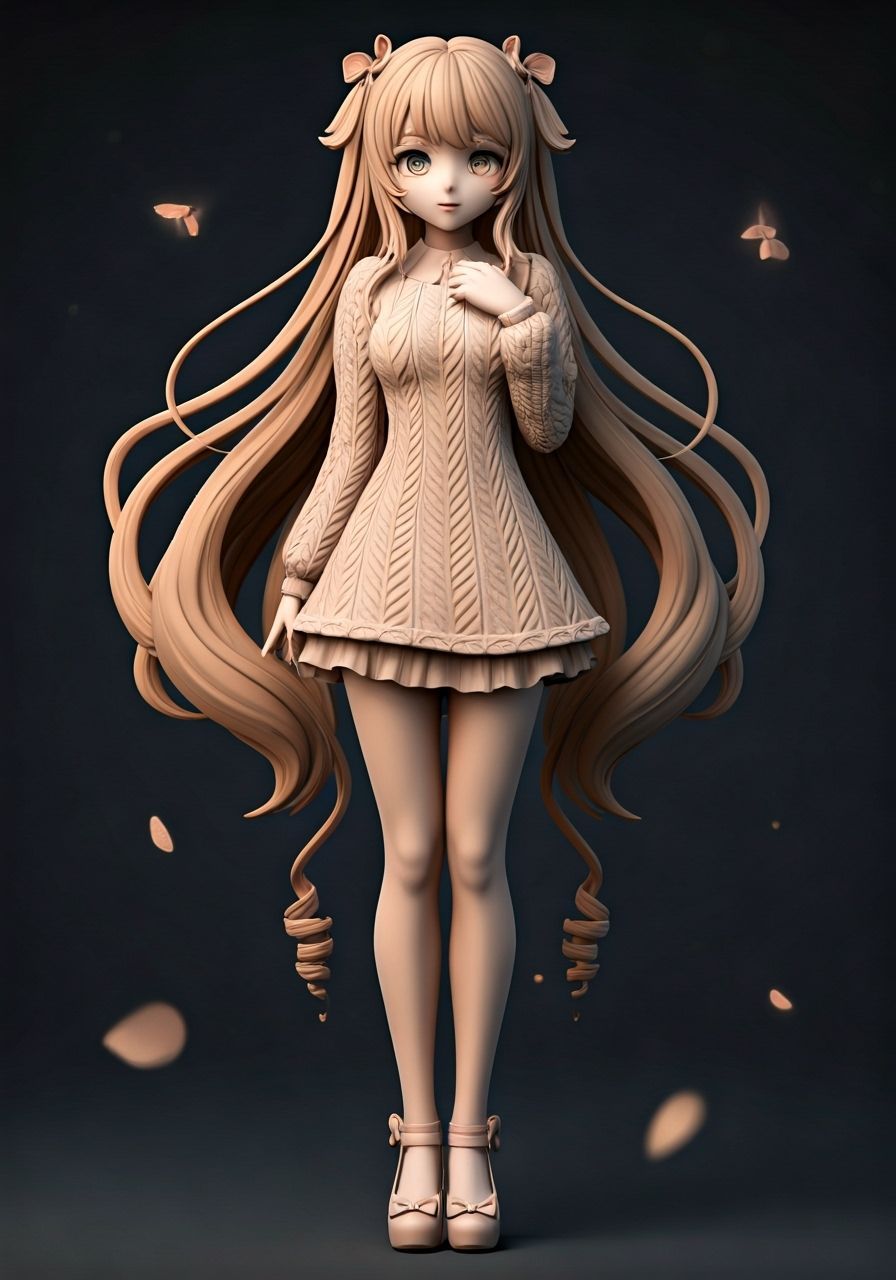 A 3D shaded anime style image of a girl made of earthy-toned clay. The figure, with long blonde hair and a knitted dress, poses in a photo studio with soft lighting. 8k resolution.