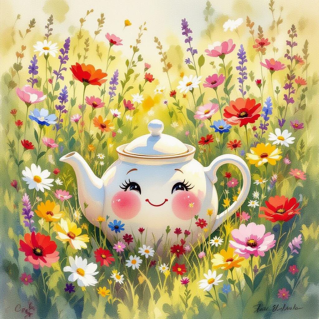 A joyful watercolor painting captures a smiling ceramic teapot surrounded by colorful wildflowers in a bright meadow. Impressionist brushstrokes highlight soft textures and warm sunlight, evoking pure happiness.