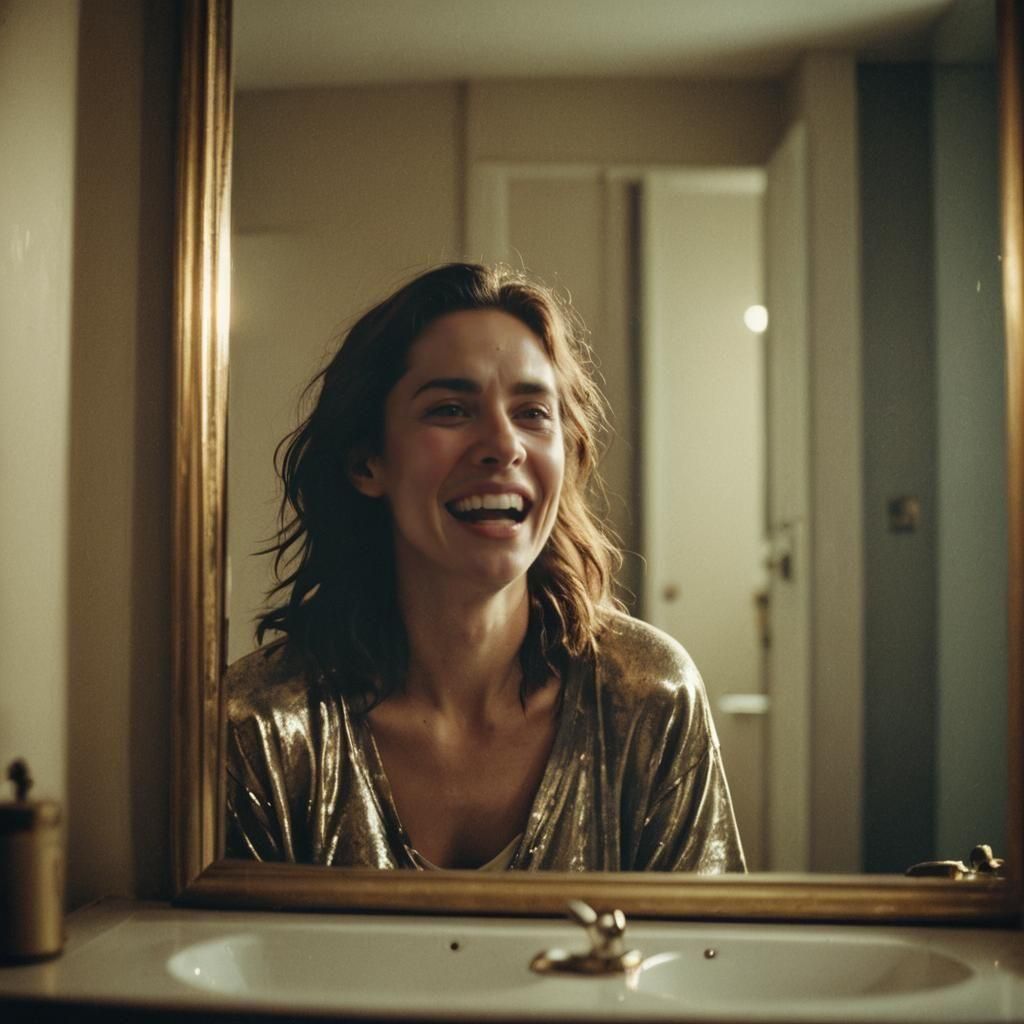 "Me río ante el espejo Cinematic film still, shot on v-raptor XL, film grain, vignette, color graded, post-processed, cinematic lighting, 35mm film, live-action, best quality, atmospheric, a masterpiece, epic, stunning, dramatic"