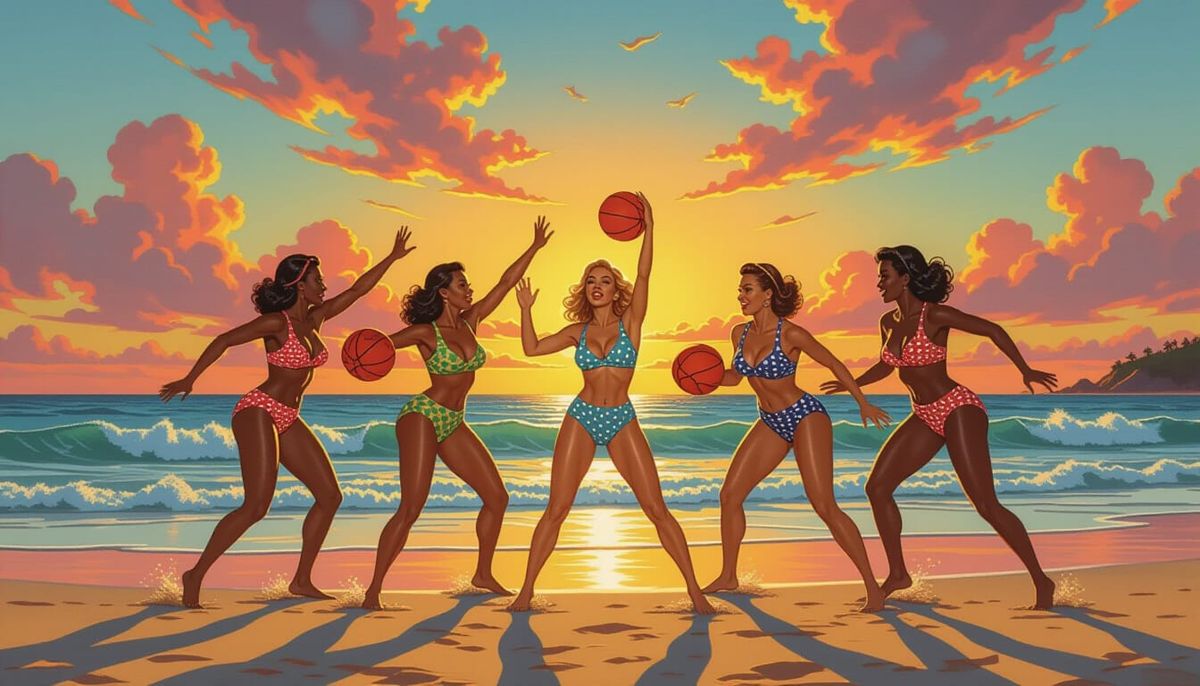 This image shows a group of strong women playing basketball on a beach at sunset. The scene is hyperrealistic with vibrant colors, reminiscent of classic pin-up art.