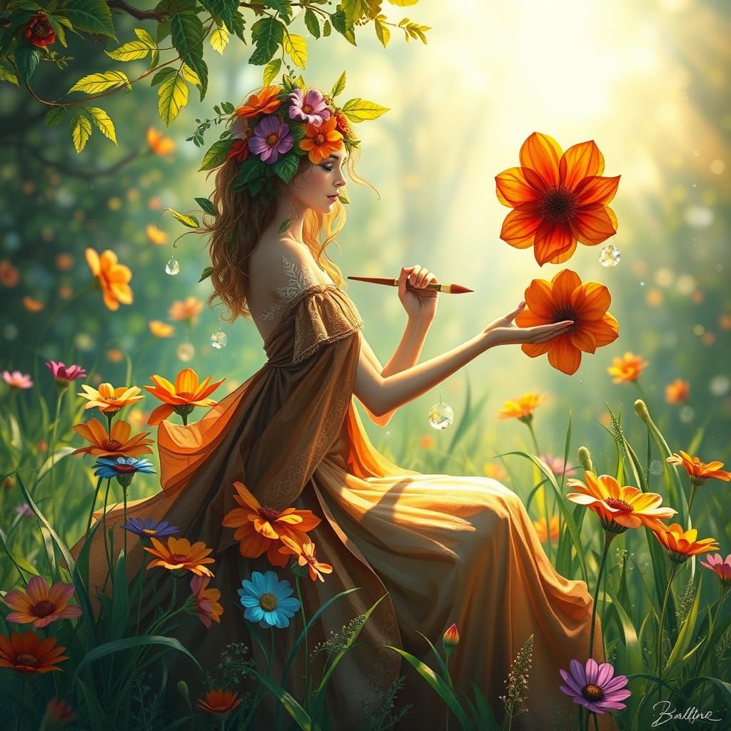 This enchanting image depicts Mother Nature tenderly painting flowers in every color of the rainbow, with soft light and delicate patterns evoking the dreamlike quality of classic illustrations and the ethereal beauty of a blooming garden.