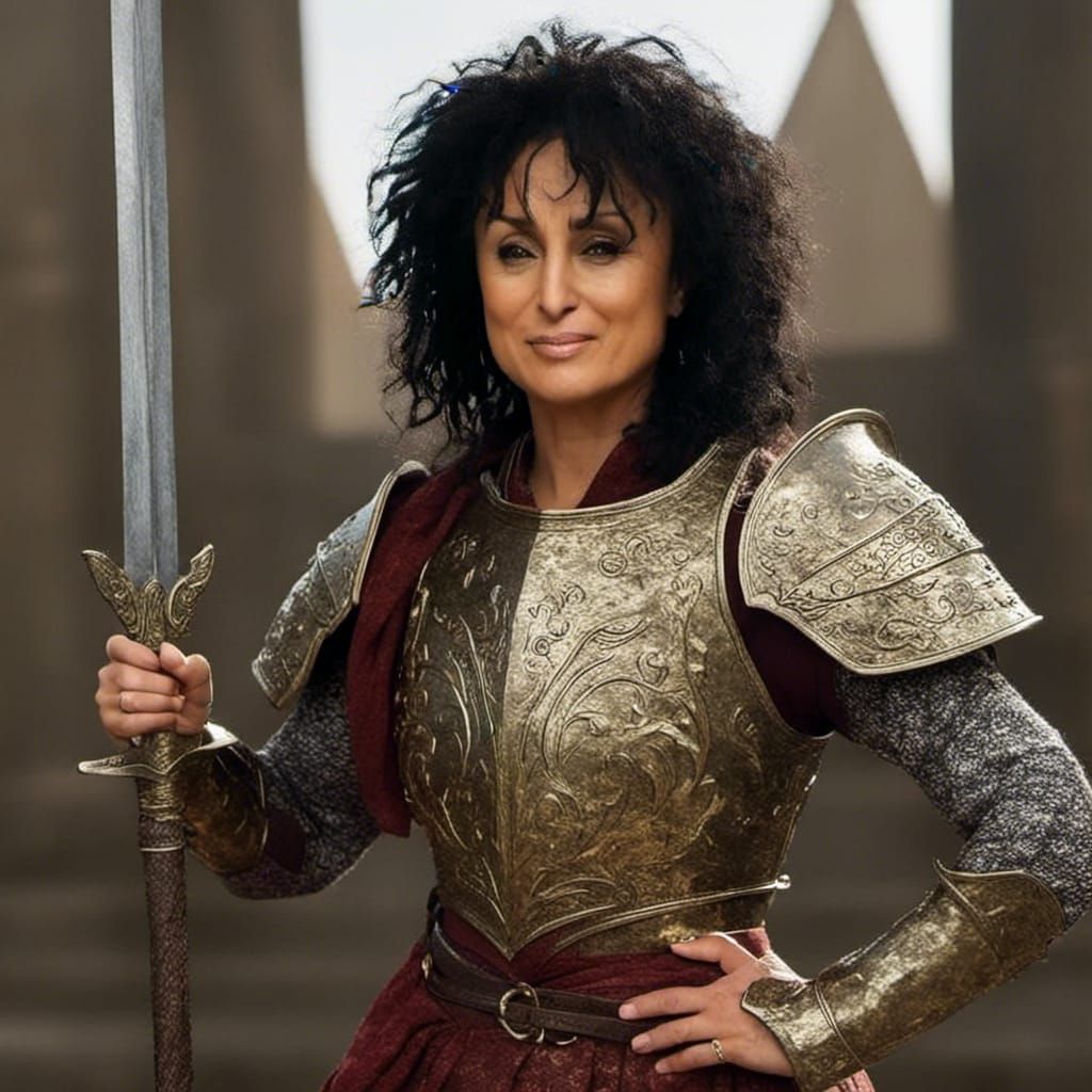 A detailed portrait of a person in medieval armour holding a broadsword. The image features intricate metal work and a shiny, fantastical aesthetic, rendered in 8k resolution.