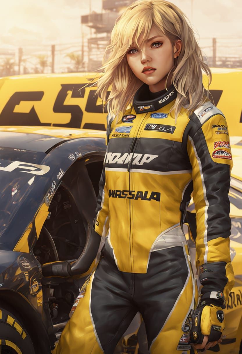This image shows a young blonde woman in a yellow racing suit next to a NASCAR vehicle. The artwork is reminiscent of 3D anime art.
