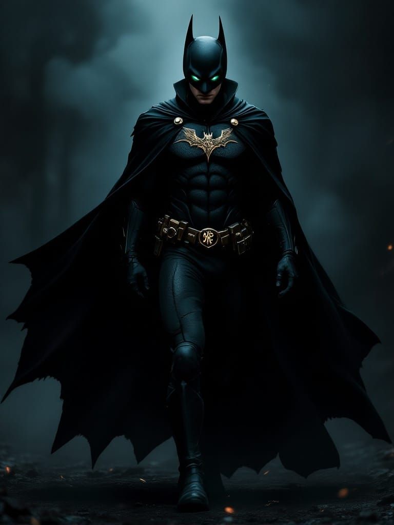 This image shows Harry Potter reimagined as a dark knight. He wears a fusion of Hogwarts robes and a Batsuit, complete with a utility belt and glowing emerald lenses. He blends magic with martial arts.