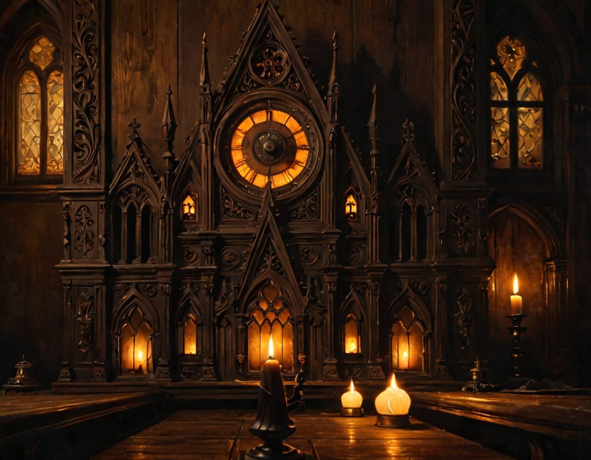 This image shows a cathedral-style radio in a dimly lit, eerie setting. The oil painting aesthetic, ornate carvings, flickering candlelight, and mysterious shadows create a vintage horror atmosphere.