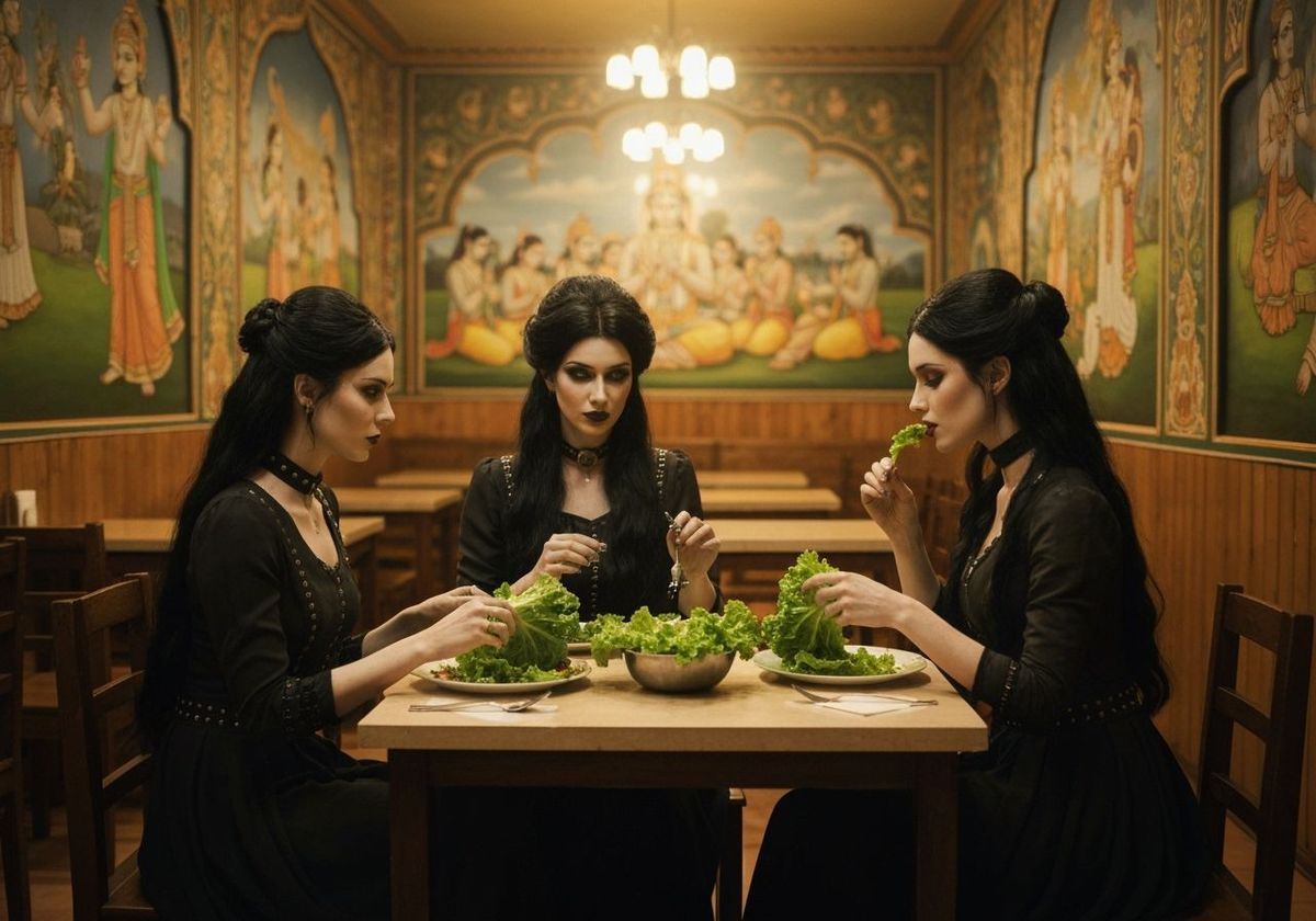 This image shows three vegan vampires enjoying a lettuce meal at a Krishnaite eatery. They are dressed in elegant gothic outfits with lace and studded details, captured in a cinematic, vintage style.