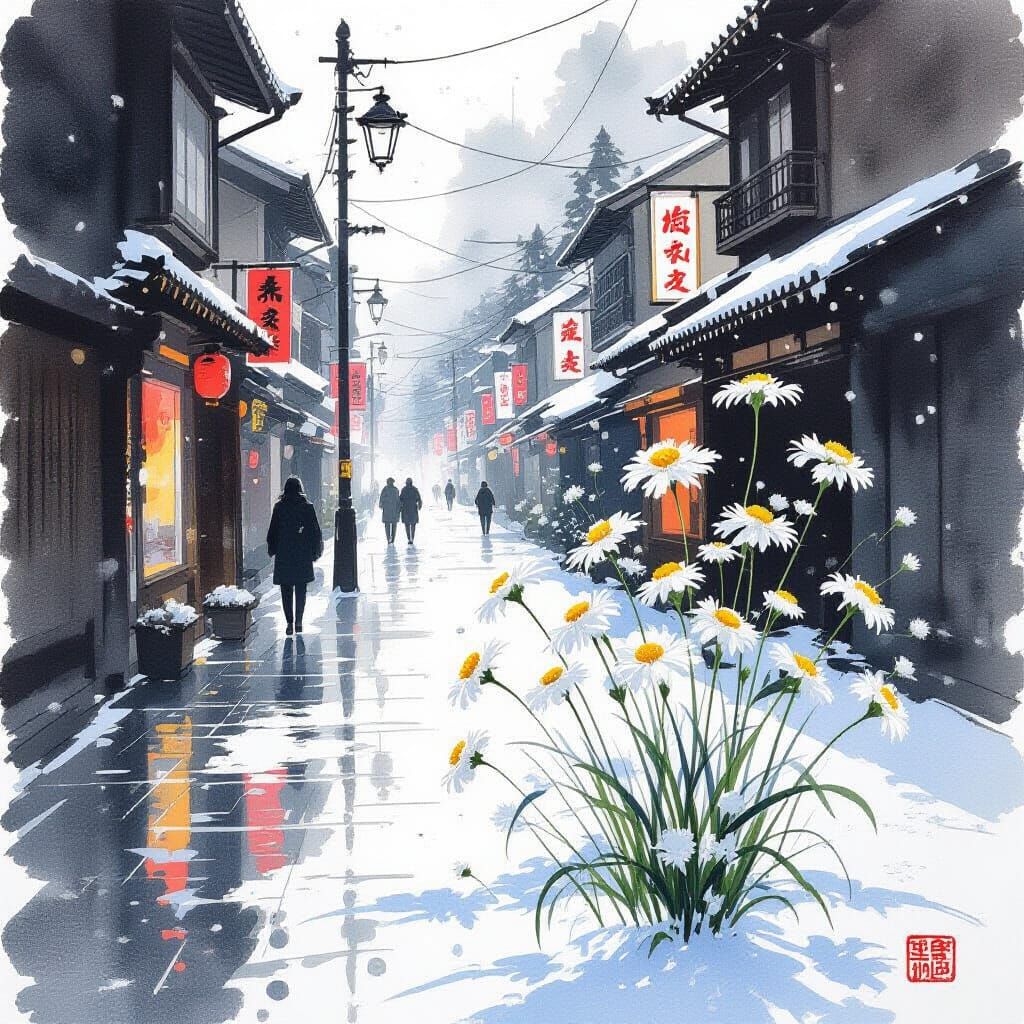 This image shows Queen Ann's Lace blooming beside a street, with heat shimmering and snow falling. The artwork evokes Japanese sumi-e painting in a minimalist aesthetic.