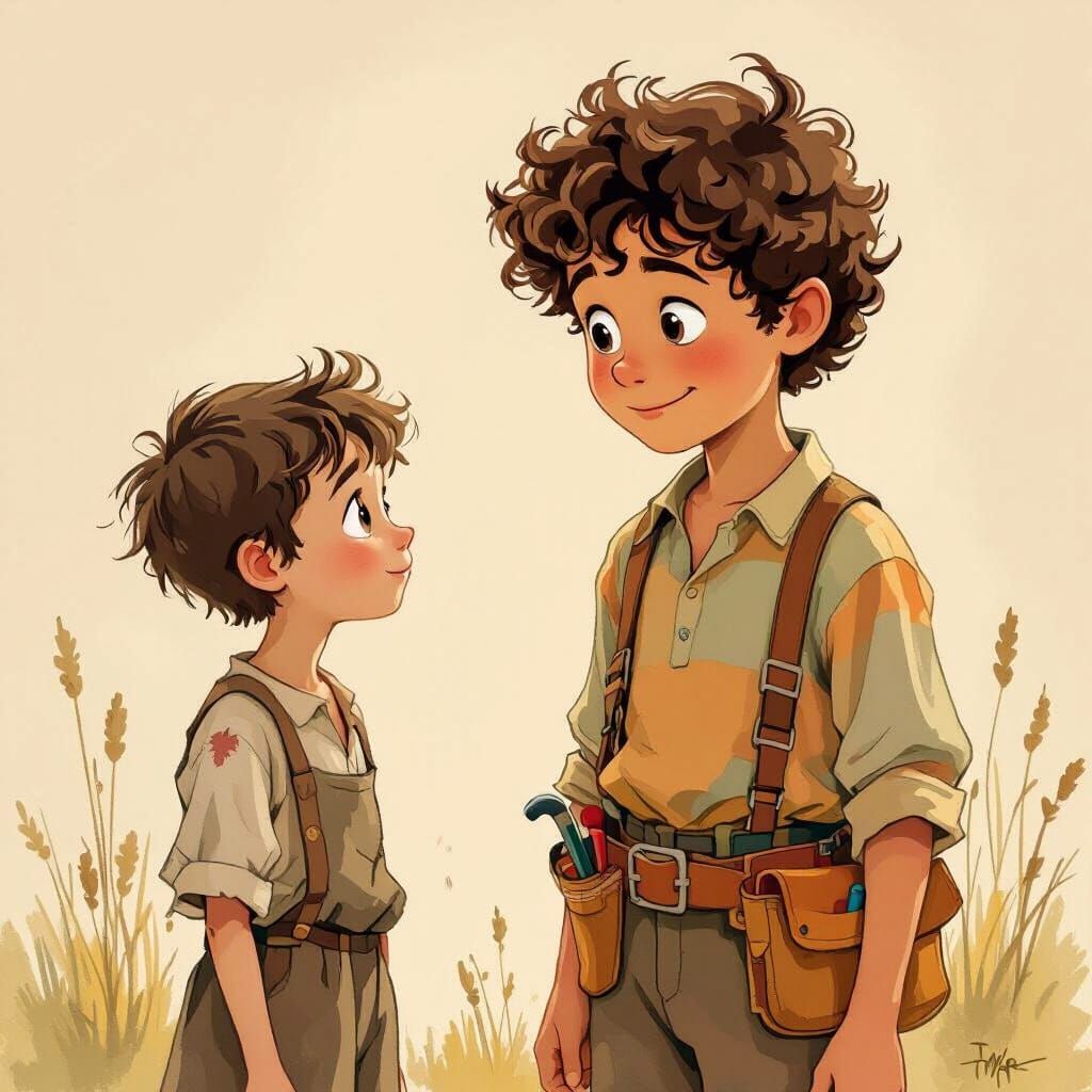 This image shows a compassionate young boy pausing to help a weary traveler. Rendered in a classic storybook style, the artwork features warm tones and soft textures to emphasize the boy's empathy.