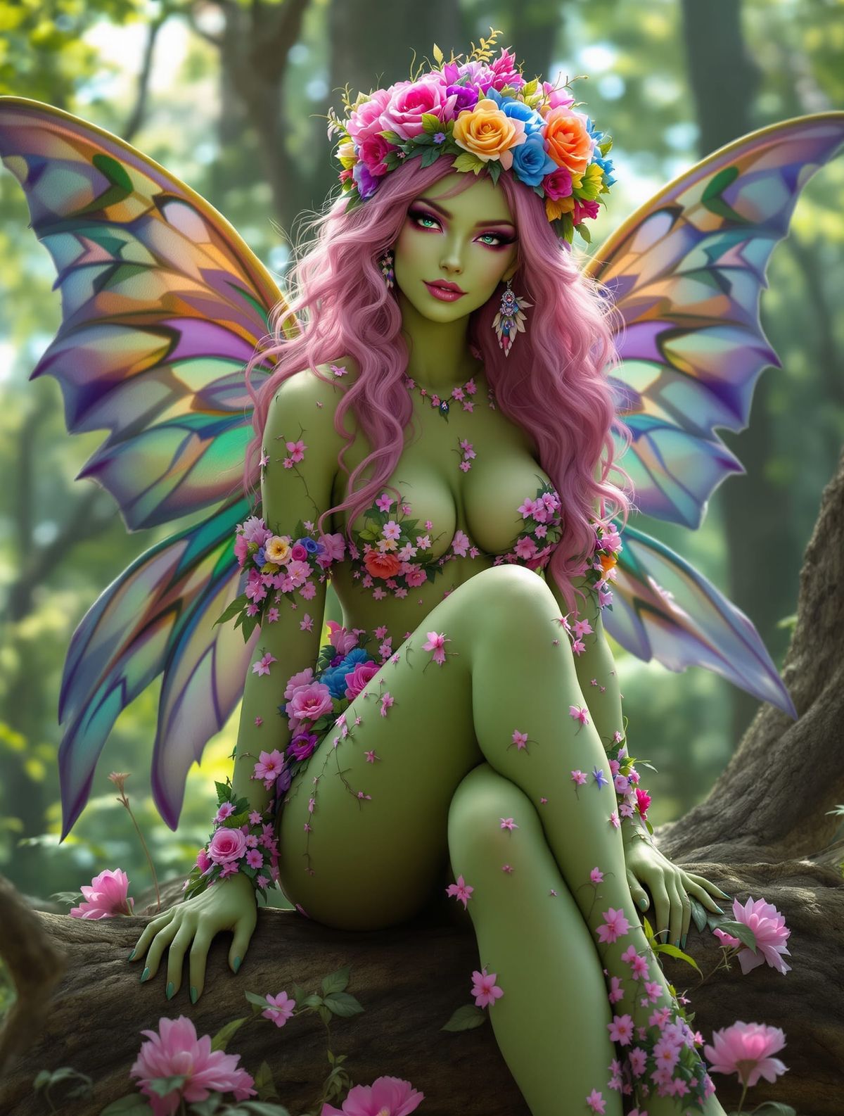 This image shows a regal, muscular fae queen with green skin and pink hair, seated on a tree trunk throne. She has vibrant wings and is adorned with flowers and makeup, in a whimsical, mystical style.