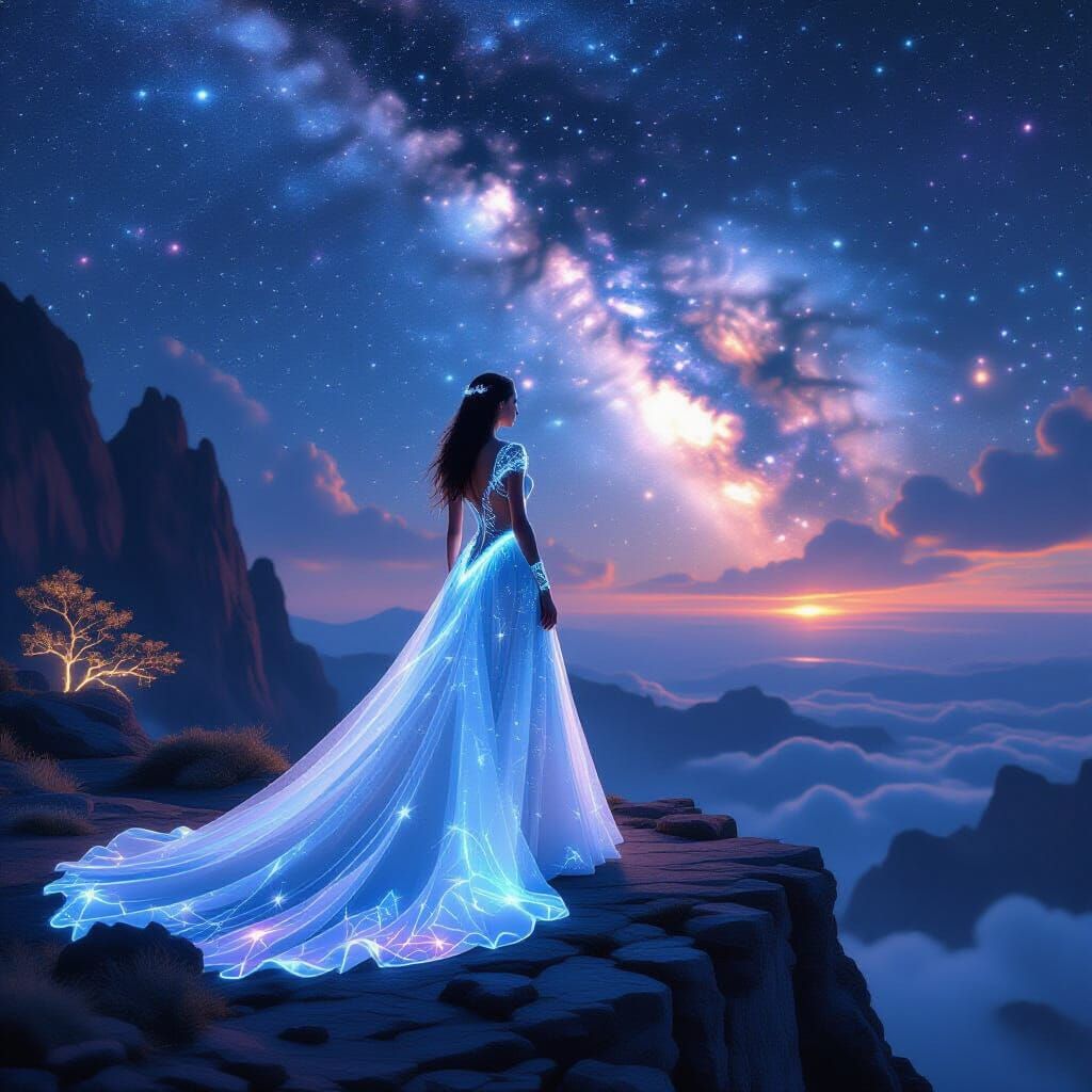 A striking picture of a woman in a glowing, futuristic gown. The scene features a nebula sky, alien flora, and surreal lighting, creating a dreamlike editorial fashion aesthetic.