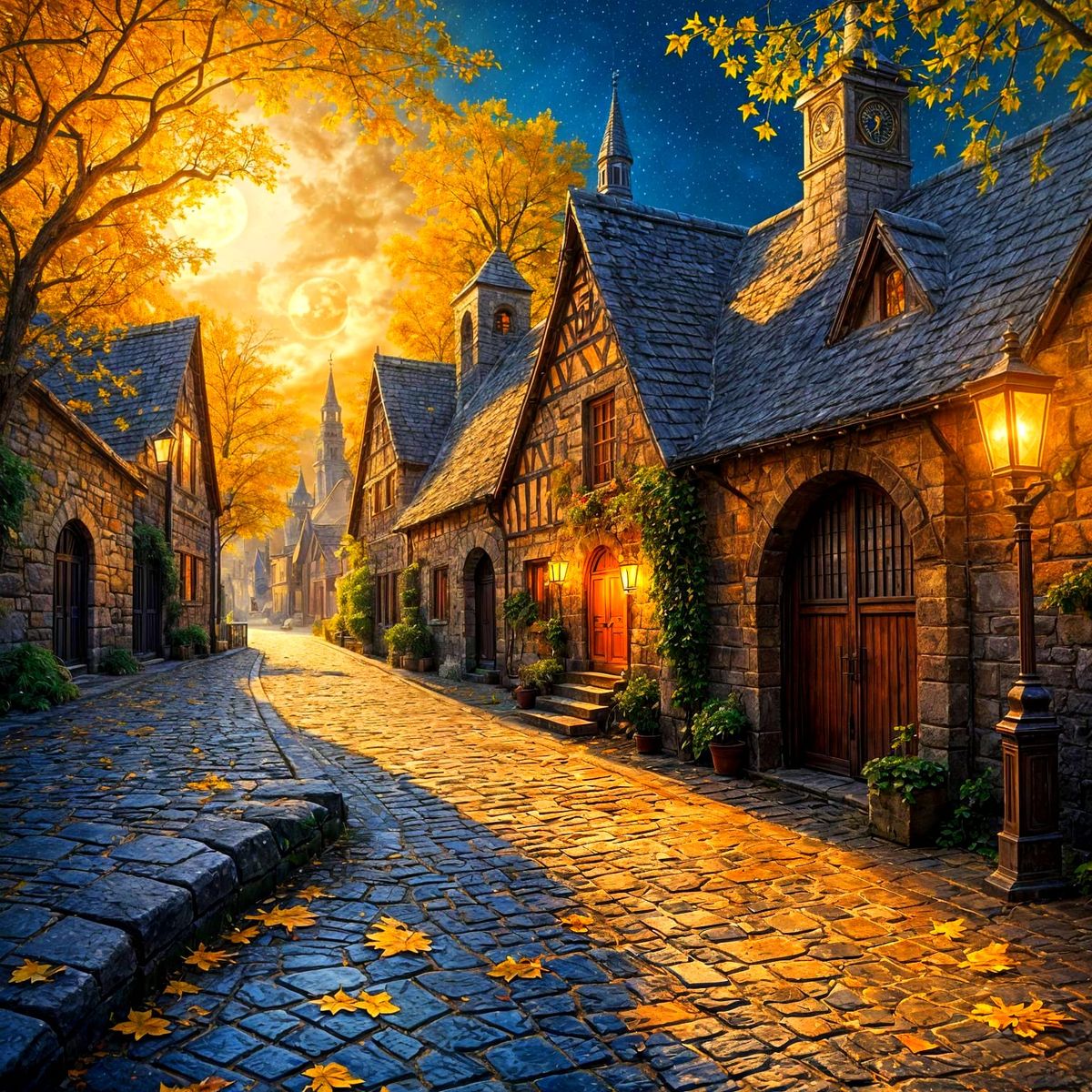 This image depicts a dreamy medieval street at night, featuring wet cobblestones, old houses, and glowing lanterns. A full moon illuminates the teal sky, creating a magical, cinematic atmosphere with high contrast and detailed textures.