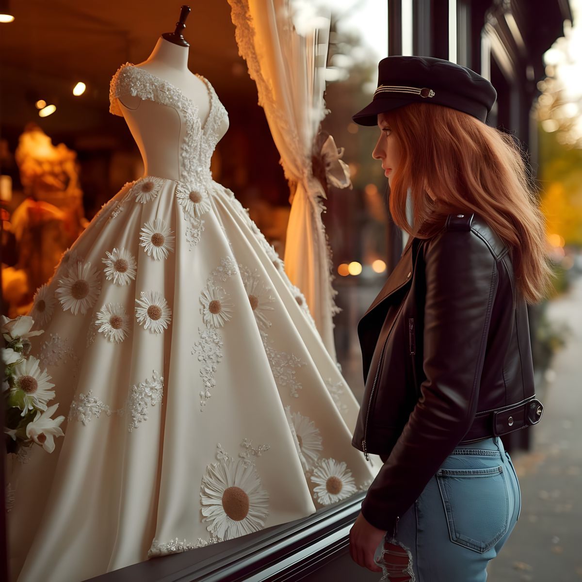 A vintage store window displays a silk wedding dress with sunflower details, while a woman in a leather jacket gazes at it, bathed in warm, late afternoon light.