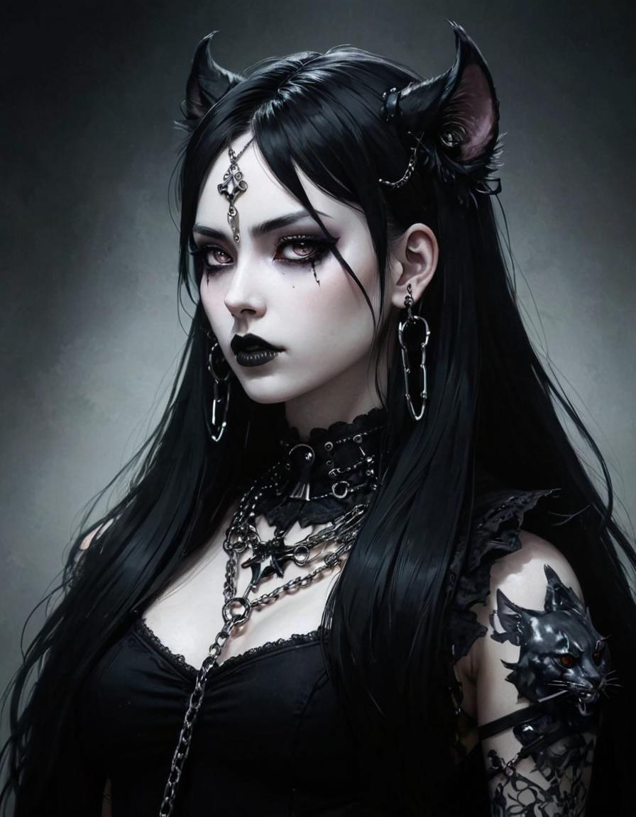 This image shows a close-up portrait of a goth anime girl. She has symmetrical nose piercings connected by a chain, cat eye makeup and an intense gaze. The artwork is richly detailed in a dark fantasy style.