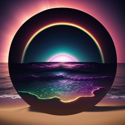 This ethereal digital painting showcases a vibrant sunset with rainbows nestled within dark burgundy and pink clouds. It features a baby turtle and starfish on shimmering gold sand, with deep purples and bright pinks creating a gradient.