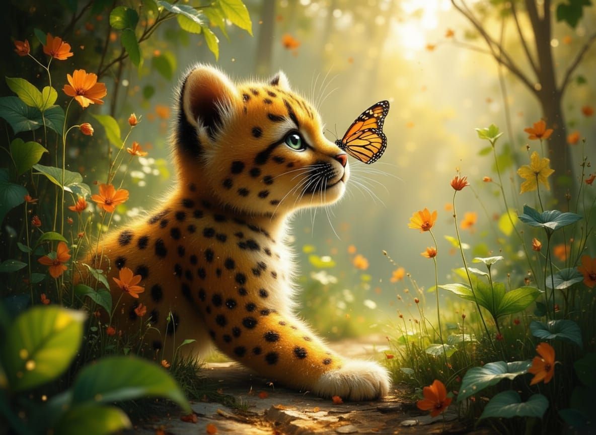 A hyperrealistic image of a baby jaguar with a butterfly on its nose, set in a majestic Amazonian jungle. Captured with National Geographic quality and oil painting textures.
