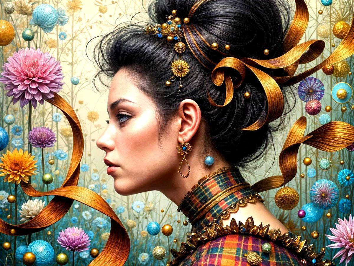 This hyperrealistic portrait showcases a woman with pale skin and honey eyes, her black hair in a bun adorned with colorful plaid ribbons. Rendered with extreme detail and soft lighting for a professional photographic quality.