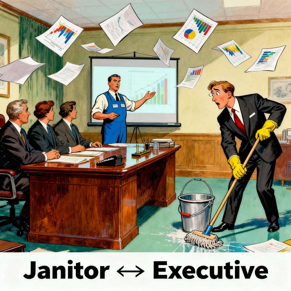 This satirical image depicts a comical office role reversal. A CEO awkwardly cleans, while a janitor confidently presents to executives, highlighting workplace absurdity in a cartoon-realistic style.