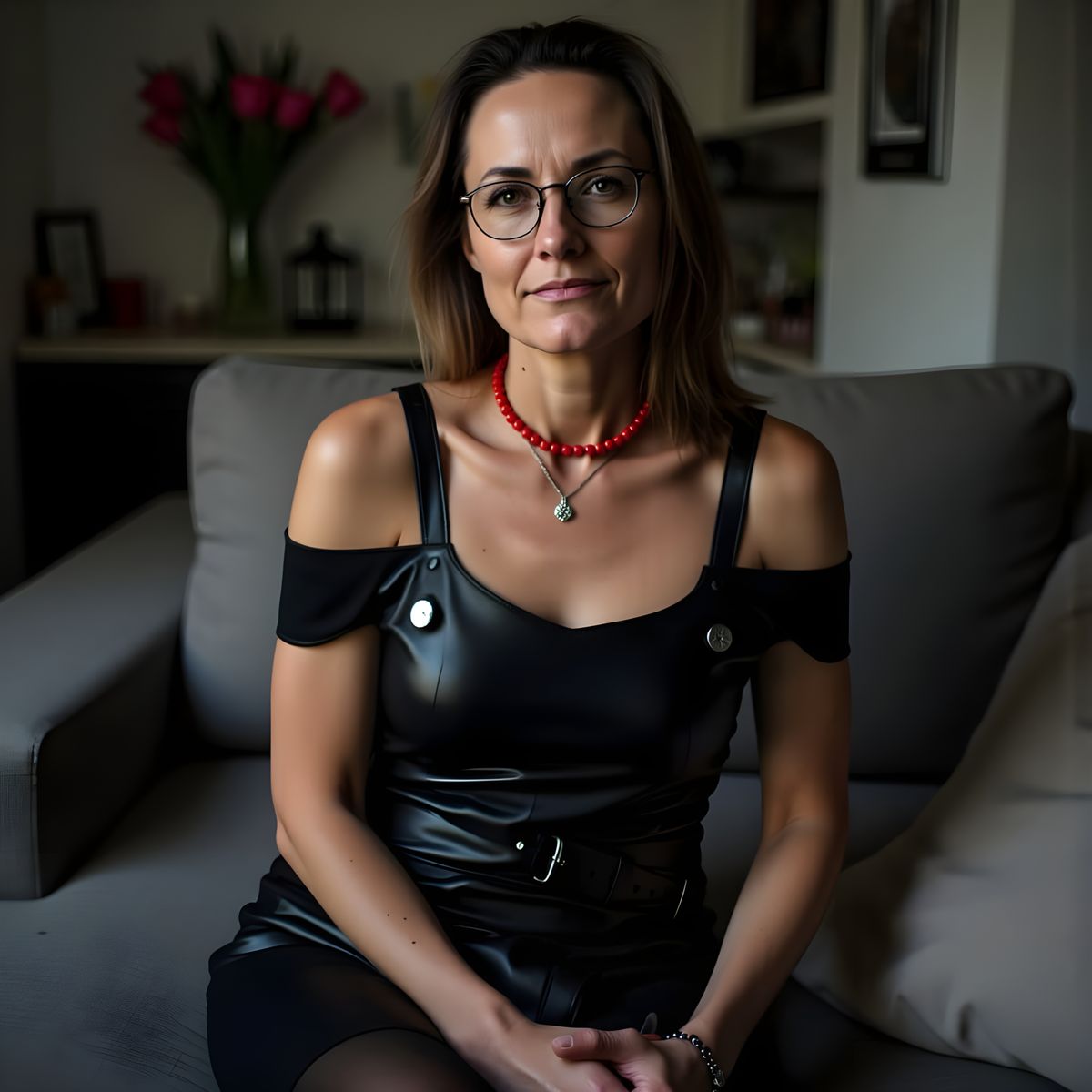 A poignant portrait of a woman in her 50s, seated in a domestic interior, with a subtle expression and a hint of melancholy, set against a dark and muted backdrop.