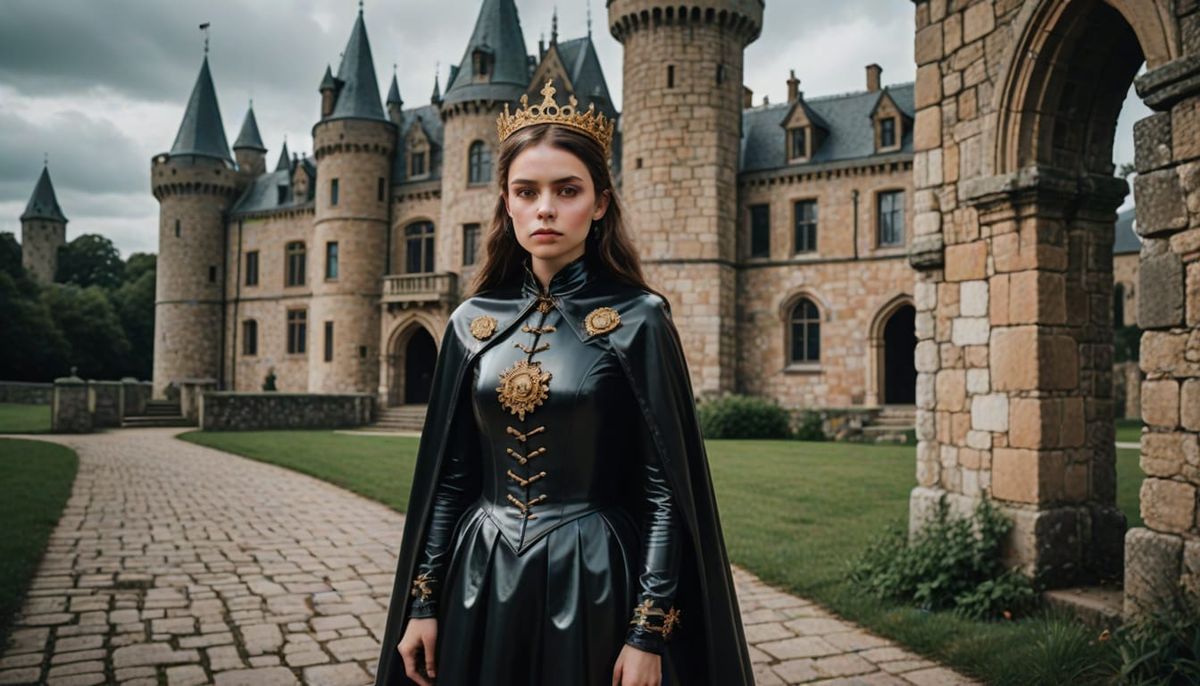 A young girl stands proudly in Victorian-inspired latex attire, complete with a flowing cape and regal crown, amidst the crumbling stones of an ancient castle, blending fantasy and history in a striking digital art piece.