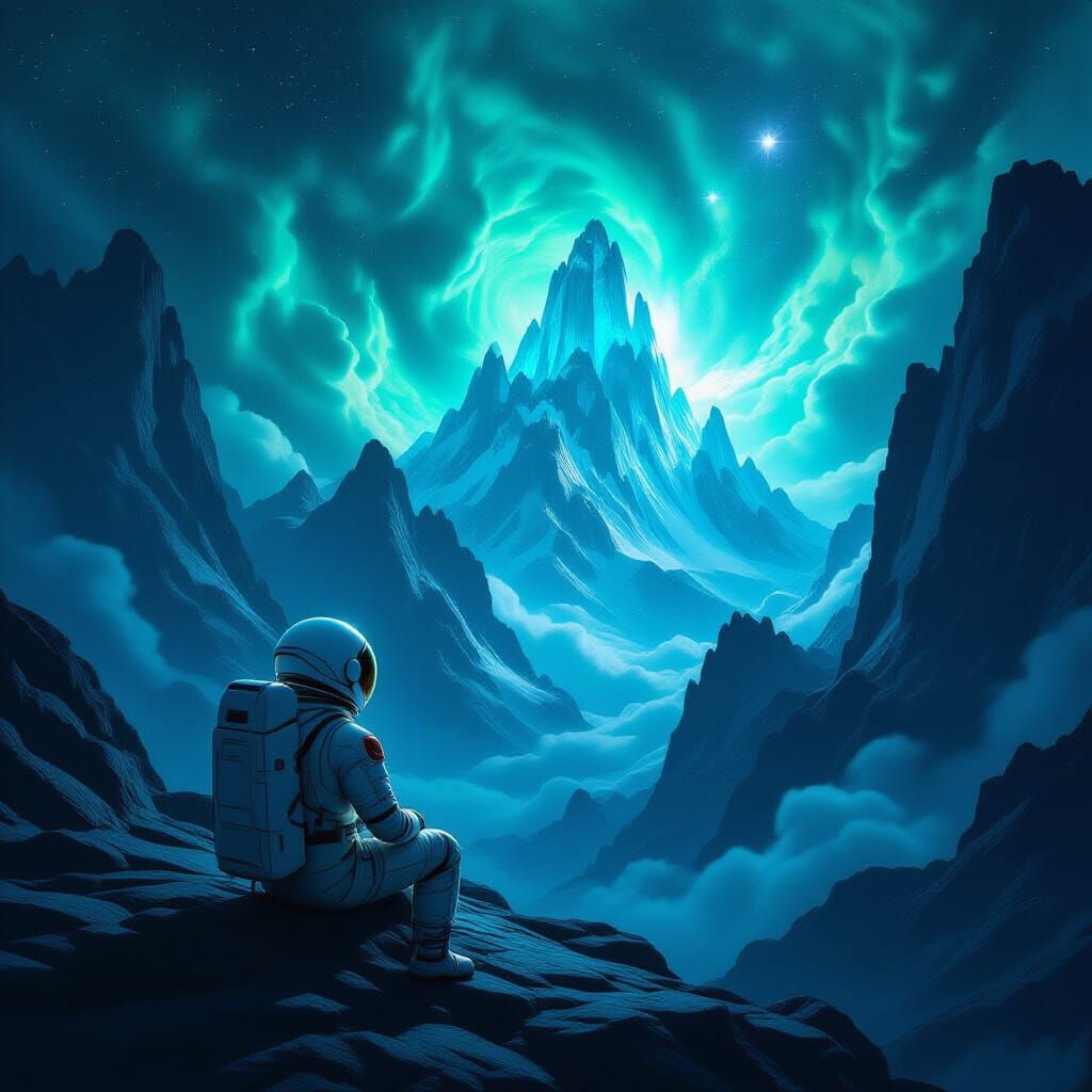 This image shows a lone astronaut observing a vast, crystal mountain range within an emerald nebula. Rendered with painterly brushstrokes and dramatic lighting, it captures the quiet grandeur of space.