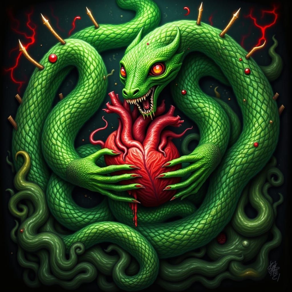 A striking picture of a three-eyed, green serpent coiled around a human heart, piercing it with fangs. The artwork features intricate biomechanical details in a dark, gothic style.