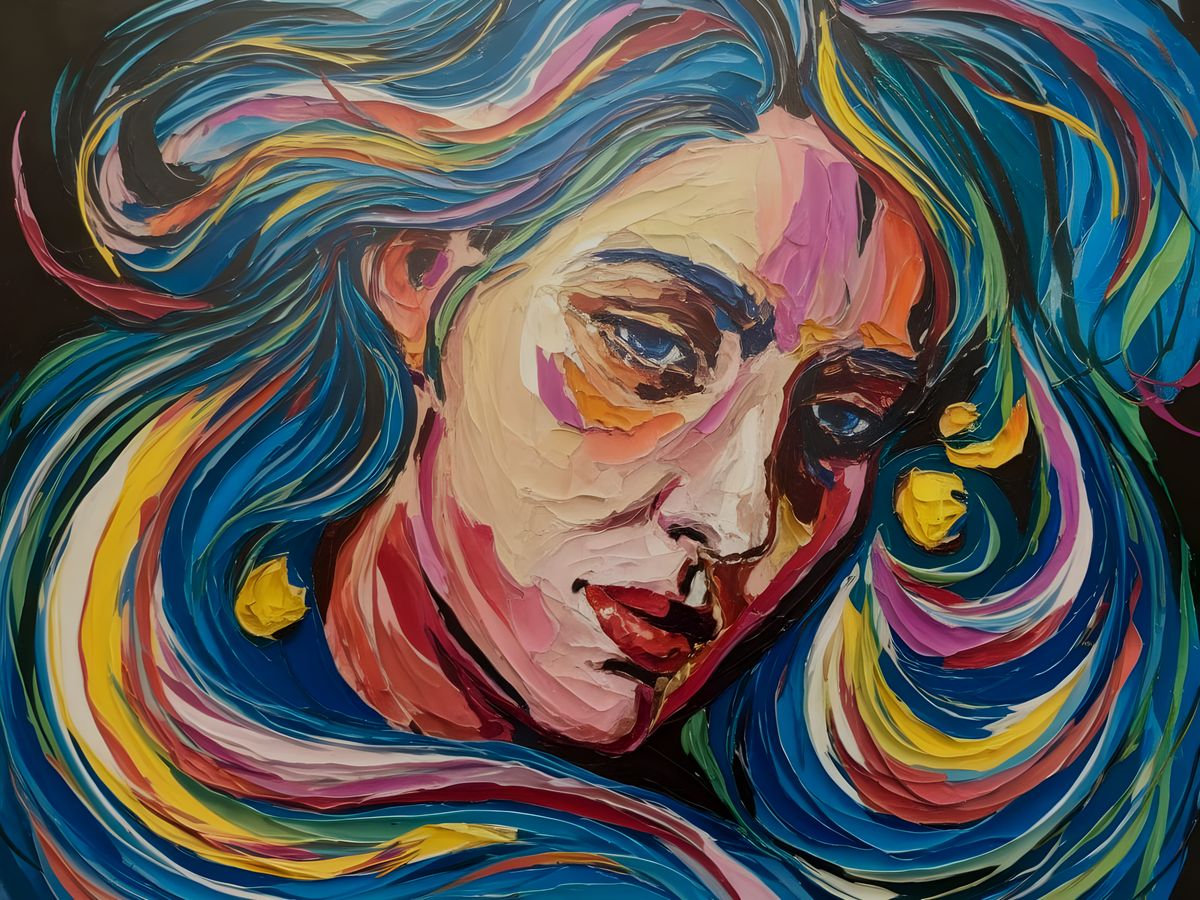 A chiaroscuro impasto painting of an undulating female form. The artwork uses light and shadow to create a sense of depth and movement in a surreal style.