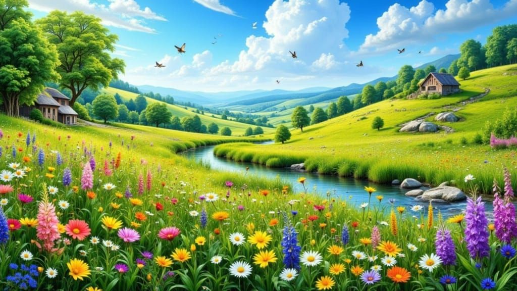 This idyllic landscape features a serene meadow filled with vibrant wildflowers, a gentle stream, and a charming spring village with gardens and rustic cottages. Inspired by the Impressionist masters, this scene is bathed in warm, soft light and features a blend of natural beauty and detailed realism.