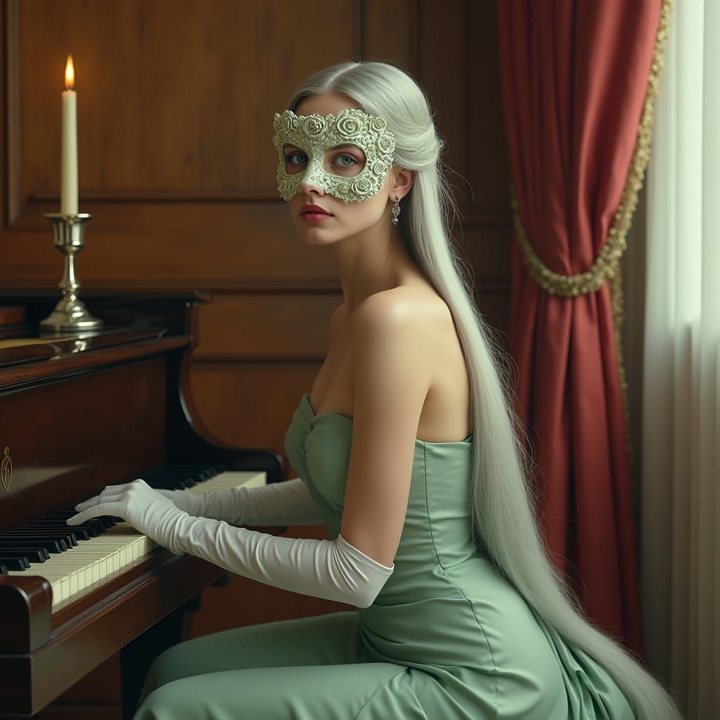 This image depicts a stately woman in a serene, dreamlike setting, surrounded by opulent details and rich textures, including a grand piano, intricately etched roses, and warm, honeyed wood tones.