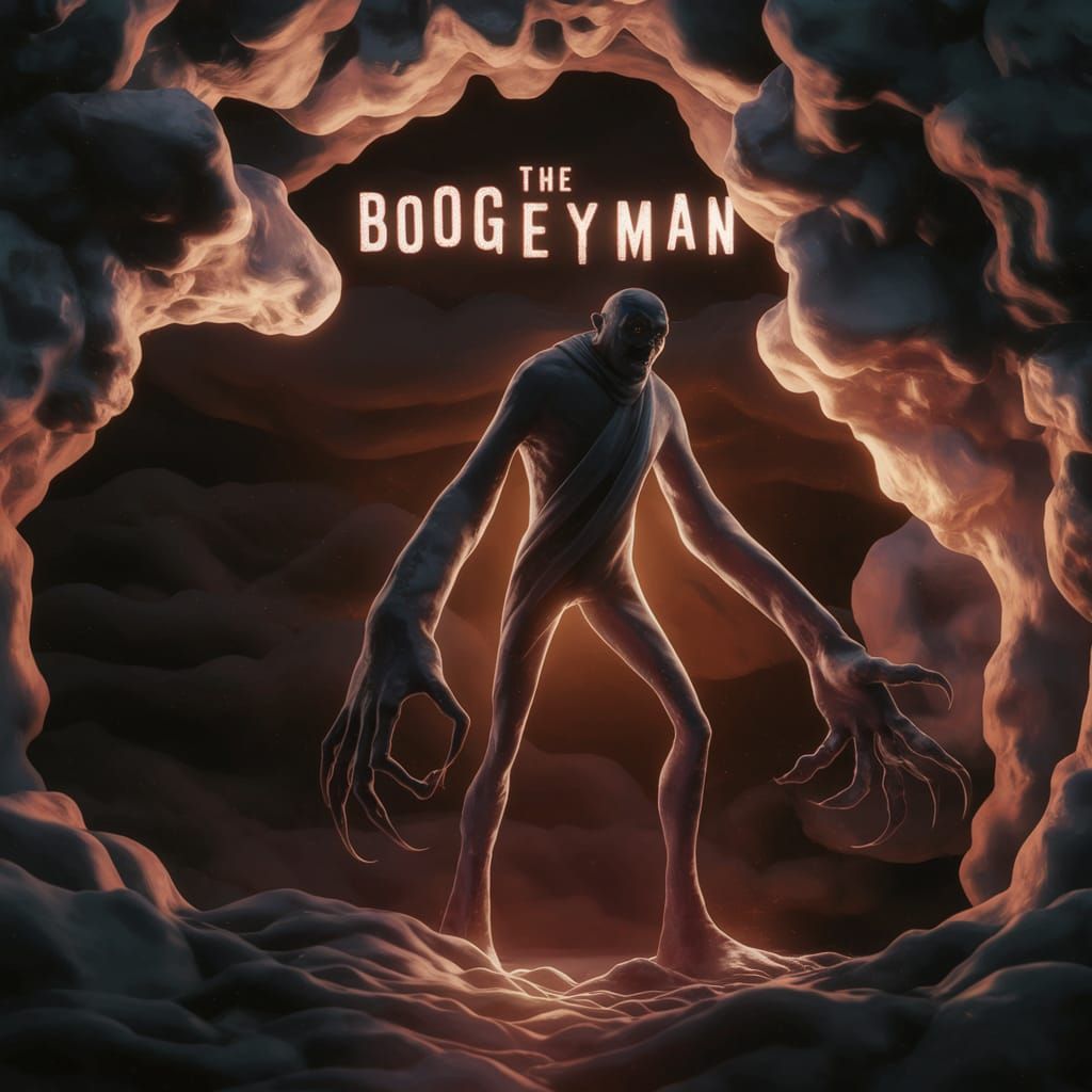 This image shows a towering, shadowy figure set against a backdrop of swirling dark clouds and mist. The humanoid figure exudes malevolence with glowing text above and below in a 3D rendered style.