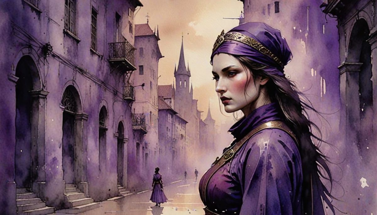This image shows a female warrior in a city, rendered in antique inky watercolor. The portrait features mystic purple hues and dancing shadows with a dreamy, vintage feel.