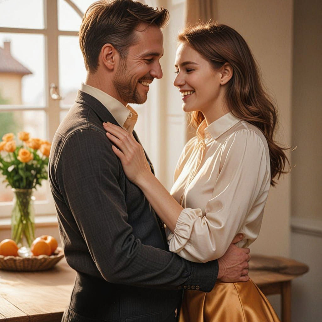 This image shows a beautiful woman in a skirt and blouse, playfully caressing her husband's face. He holds a pie, smiling in the golden afternoon light, capturing an intimate, cozy moment.
