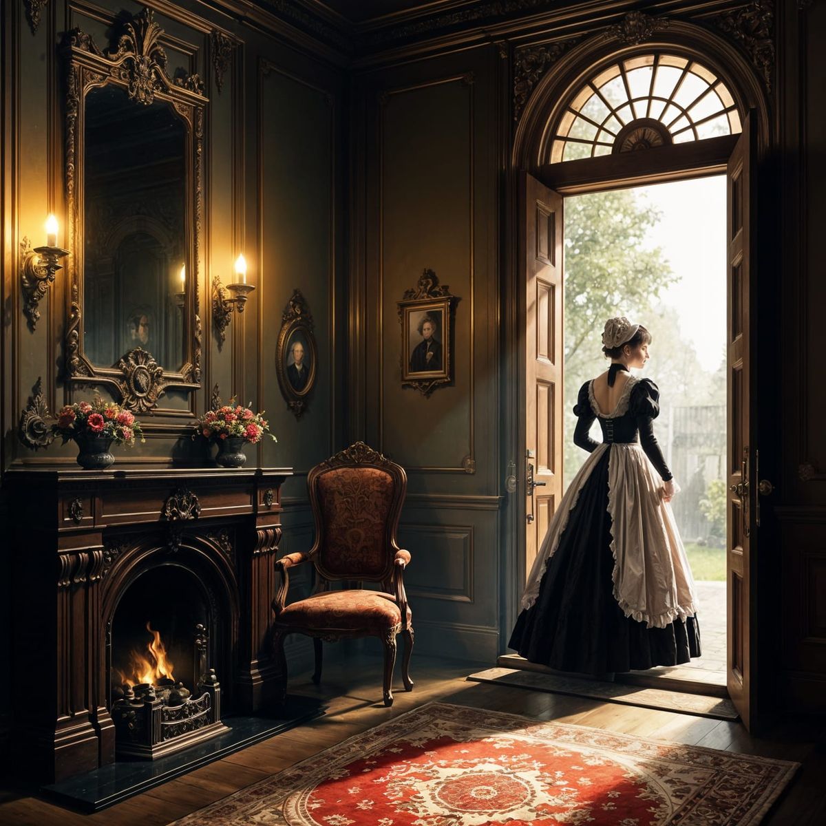 This image depicts a refined Victorian-era maid standing in a stately doorway, dressed in traditional attire, as she awaits her master's return home.