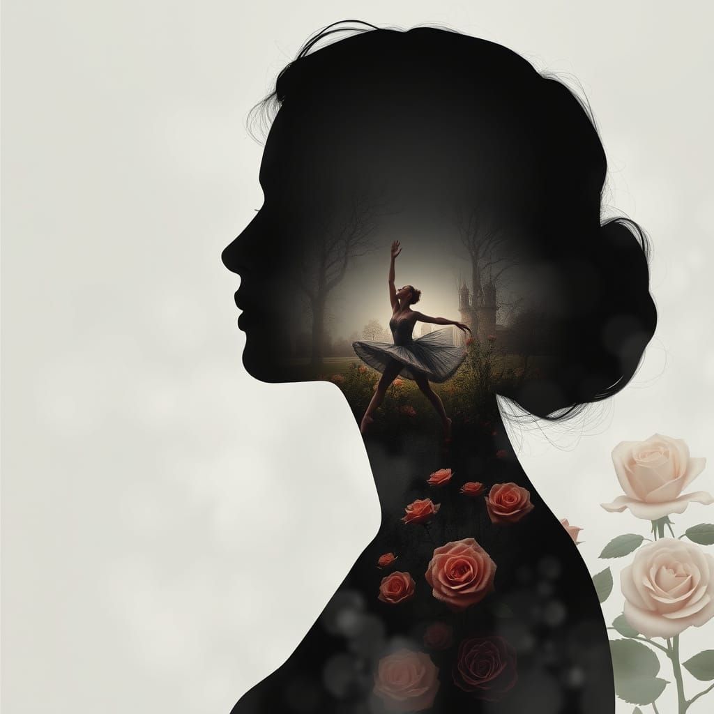 This image shows a female silhouette filled with a dreamy landscape. A ballerina dances in a rose garden, all rendered with soft lighting and ethereal beauty in the style of vintage ink painting.