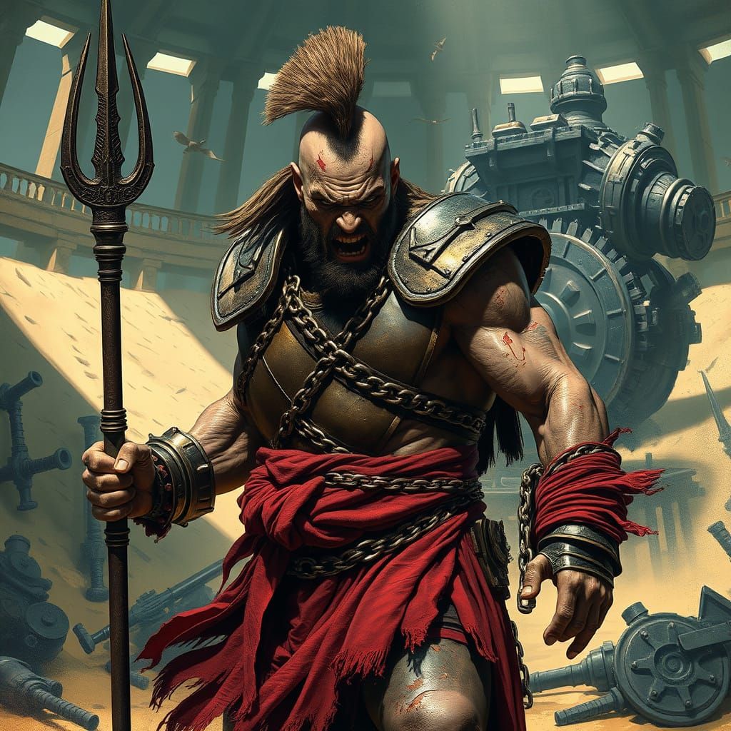 A battle-scarred gladiator stands in a sunlit arena, his battered armor and primal rage evident. The scene blends industrial grit with intricate sci-fi details in a steampunk aesthetic.