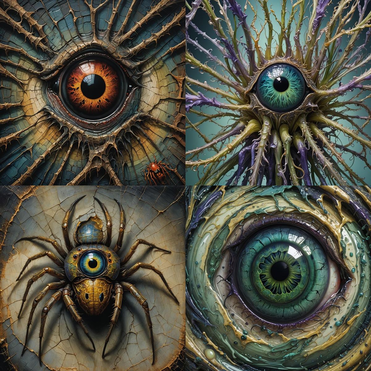 A striking picture of a macro eye with a spider emerging. This detailed matte painting uses deep, complementary colors with intricate, fantastical surrealist oil painting textures.