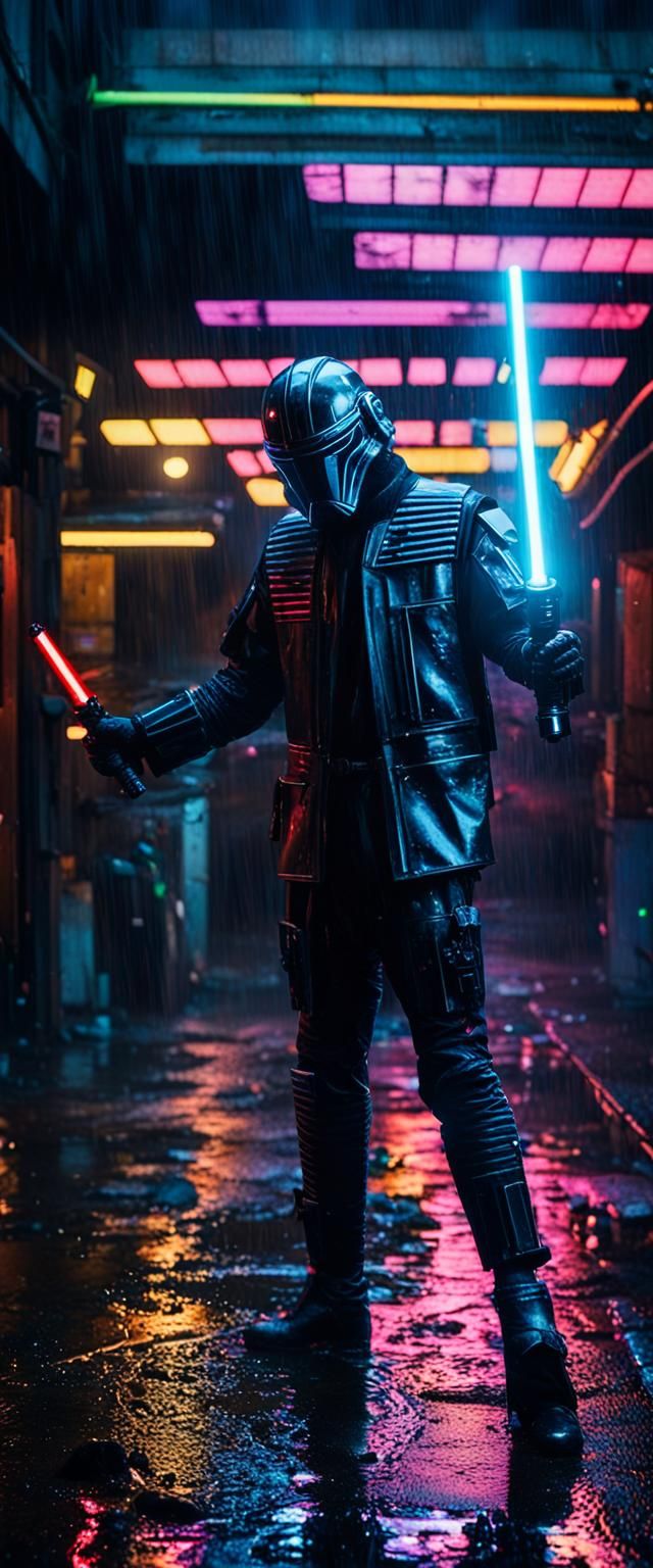This image shows a man in a Star Wars-like spacesuit holding a lightsaber in a dark, rainy, neon-lit alleyway. The cyberpunk aesthetic features vibrant colors and a Blade Runner-inspired cityscape.