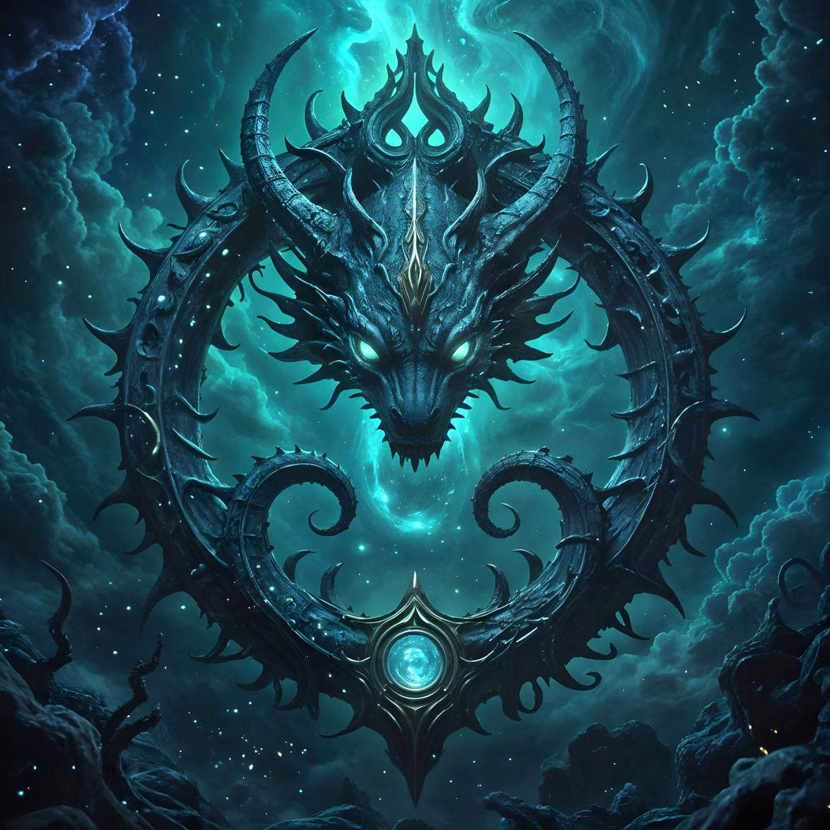 This image features a detailed, holographic cosmic illustration of a Leviathan and Kraken inspired emblem. It's rendered with high contrast and sharp focus, evoking a moody, atmospheric feel.